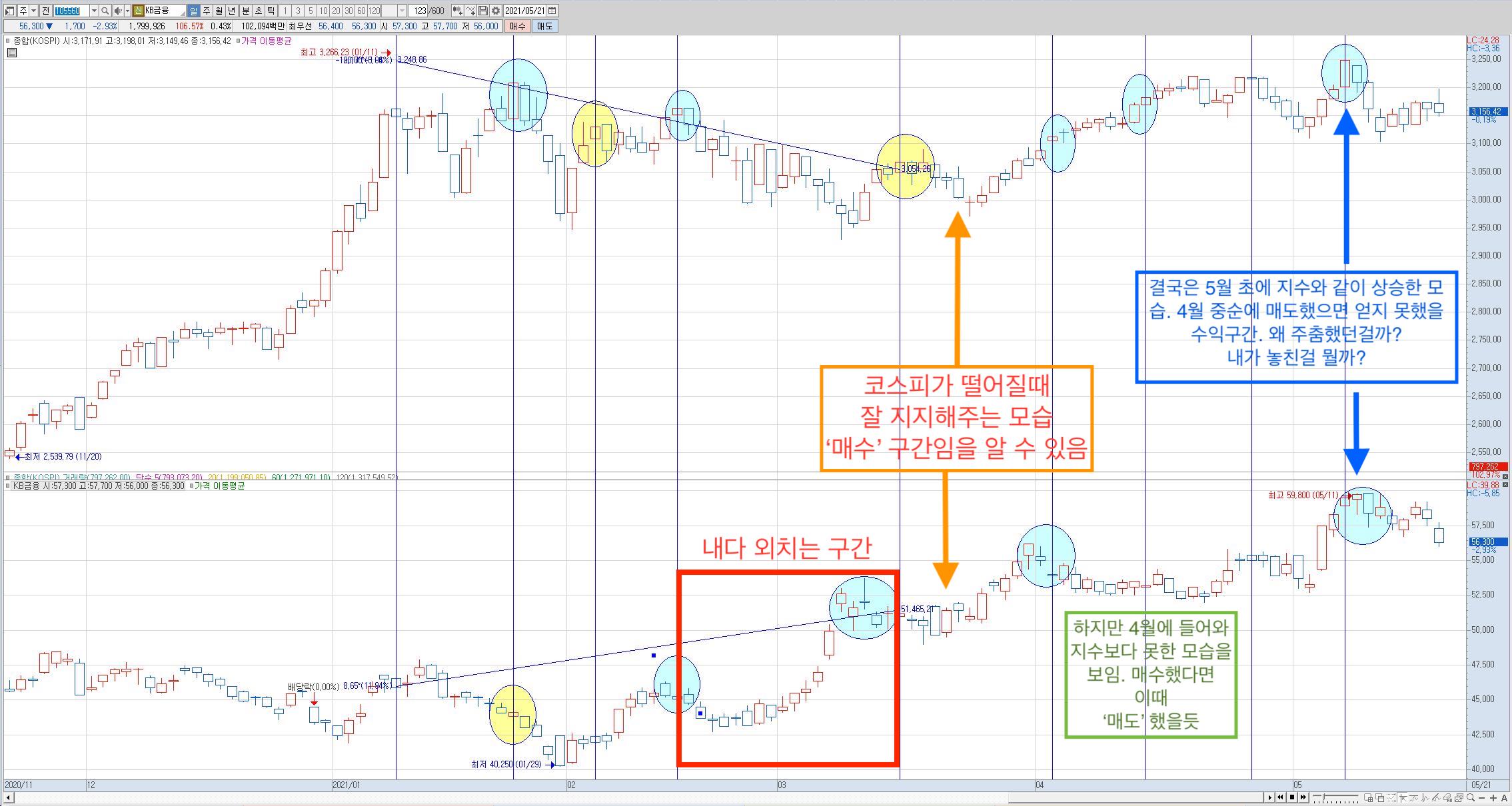 : '내다' 종목을 매수 후에 지수가 떨어질때 같이 떨어지는 건 괜찮은 건가? 그러고 보니 (SK텔레콤) 역시 같은 시기에 지수와 함께 하락하고 있네.